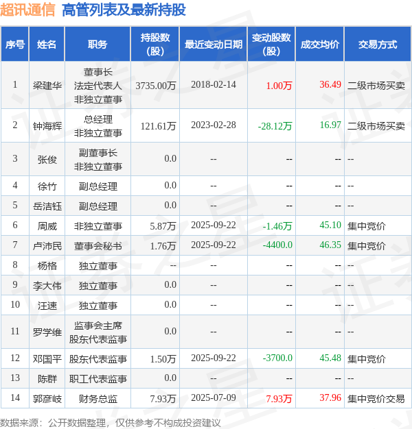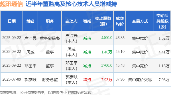 超讯通信近半年内的董监高及核心技术人员增减持详情如下: