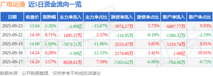 9月23日的资金流向数据方面,主力资金净流出1.09亿元,占总成交额15.67%,游资资金净流入3974.27万元,占总成交额5.73%,散户资金净流入6887.77万元,占总成交额9.93%。