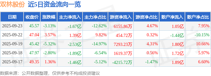 证券之星消息,截至2025年9月23日收盘,双林股份(300100)报收于45.57元,下跌3.12%,换手率5.23%,成交量28.88万手,成交额13.19亿元。