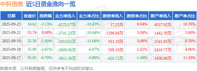 证券之星消息,截至2025年9月23日收盘,中科信息(300678)报收于34.62元,下跌3.13%,换手率4.39%,成交量12.77万手,成交额4.39亿元。