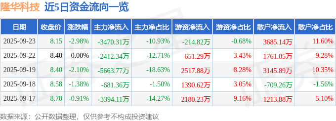 证券之星消息,截至2025年9月23日收盘,隆华科技(300263)报收于8.15元,下跌2.98%,换手率4.0%,成交量39.03万手,成交额3.18亿元。