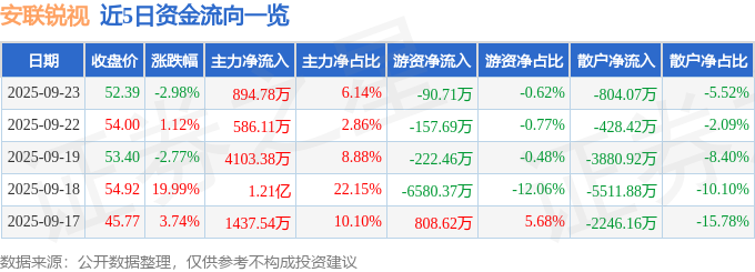 证券之星消息,截至2025年9月23日收盘,安联锐视(301042)报收于52.39元,下跌2.98%,换手率4.23%,成交量2.79万手,成交额1.46亿元。