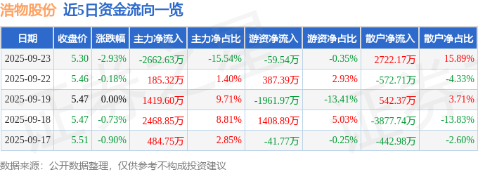 证券之星消息,截至2025年9月23日收盘,浩物股份(000757)报收于5.3元,下跌2.93%,换手率6.09%,成交量32.45万手,成交额1.71亿元。