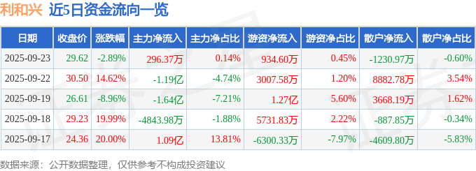 证券之星消息,截至2025年9月23日收盘,利和兴(301013)报收于29.62元,下跌2.89%,换手率37.4%,成交量70.78万手,成交额20.6亿元。