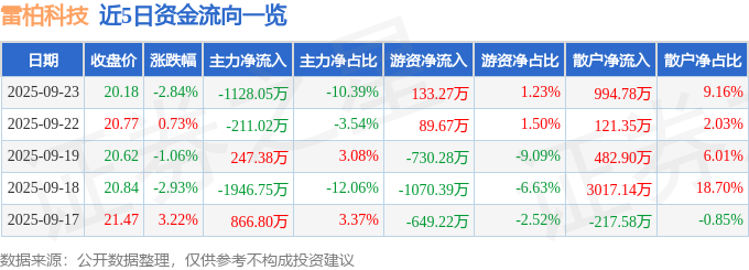 证券之星消息,截至2025年9月23日收盘,雷柏科技(002577)报收于20.18元,下跌2.84%,换手率1.92%,成交量5.4万手,成交额1.09亿元。