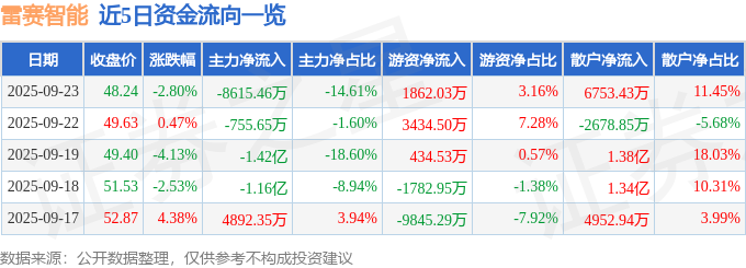 证券之星消息,截至2025年9月23日收盘,雷赛智能(002979)报收于48.24元,下跌2.8%,换手率5.53%,成交量12.23万手,成交额5.9亿元。