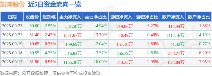证券之星消息,截至2025年9月23日收盘,凯淳股份(301001)报收于30.6元,下跌2.55%,换手率4.38%,成交量2.2万手,成交额6705.11万元。