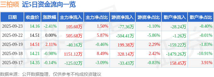 证券之星消息,截至2025年9月23日收盘,三柏硕(001300)报收于14.16元,下跌2.41%,换手率7.52%,成交量4.98万手,成交额7040.14万元。