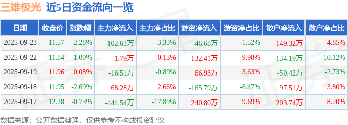 证券之星消息,截至2025年9月23日收盘,三雄极光(300625)报收于11.57元,下跌2.28%,换手率1.66%,成交量2.69万手,成交额3079.53万元。