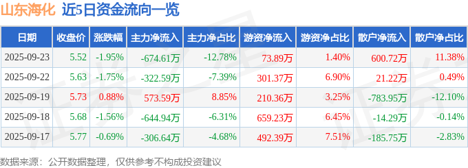 证券之星消息,截至2025年9月23日收盘,山东海化(000822)报收于5.52元,下跌1.95%,换手率1.07%,成交量9.55万手,成交额5280.19万元。