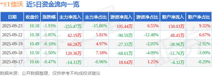 证券之星消息,截至2025年9月23日收盘,*ST佳沃(300268)报收于10.18元,下跌1.93%,换手率1.19%,成交量1.59万手,成交额1610.41万元。