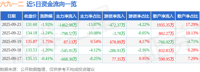 证券之星消息,截至2025年9月23日收盘,六九一二(301592)报收于131.6元,下跌1.92%,换手率4.87%,成交量8522.0手,成交额1.12亿元。