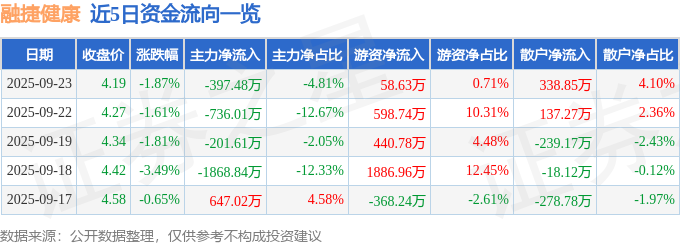 证券之星消息,截至2025年9月23日收盘,融捷健康(300247)报收于4.19元,下跌1.87%,换手率2.48%,成交量19.95万手,成交额8264.92万元。