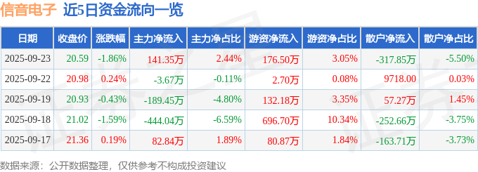 证券之星消息,截至2025年9月23日收盘,信音电子(301329)报收于20.59元,下跌1.86%,换手率4.73%,成交量2.84万手,成交额5782.36万元。
