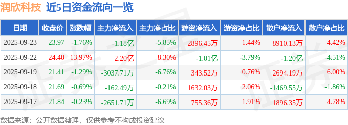 证券之星消息,截至2025年9月23日收盘,润欣科技(300493)报收于23.97元,下跌1.76%,换手率16.81%,成交量85.14万手,成交额20.17亿元。
