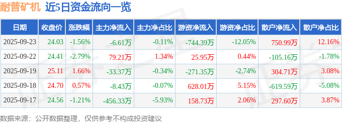 证券之星消息,截至2025年9月23日收盘,耐普矿机(300818)报收于24.03元,下跌1.56%,换手率2.37%,成交量2.59万手,成交额6176.11万元。