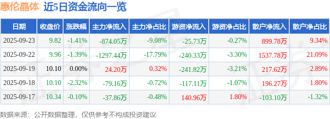 证券之星消息,截至2025年9月23日收盘,惠伦晶体(300460)报收于9.82元,下跌1.41%,换手率3.55%,成交量9.96万手,成交额9630.94万元。