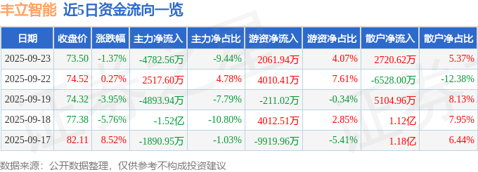 证券之星消息,截至2025年9月23日收盘,丰立智能(301368)报收于73.5元,下跌1.37%,换手率10.86%,成交量6.96万手,成交额5.07亿元。