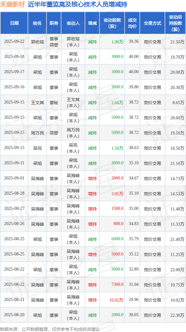 禾盛新材近半年内的董监高及核心技术人员增减持详情如下:
