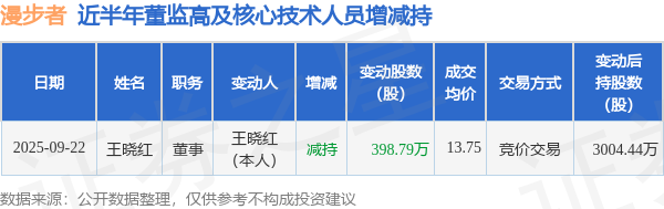 证券之星消息,根据9月23日市场公开信息、上市公司公告及交易所披露数据整理,漫步者(002351)最新董监高及相关人员股份变动情况:2025年9月22日公司董事王晓红共减持公司股份398.79万股,占公司总股本为0.4485%。变动期间公司股价上涨5.57%,9月22日当日收盘报13.84元。