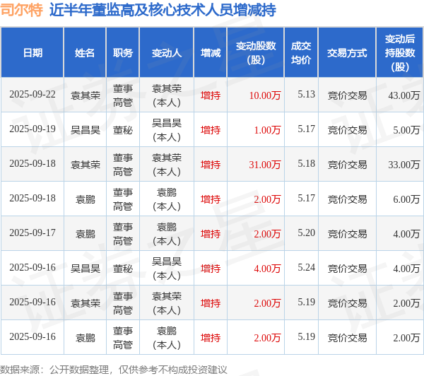 证券之星消息,根据9月23日市场公开信息、上市公司公告及交易所披露数据整理,司尔特(002538)最新董监高及相关人员股份变动情况:2025年9月22日公司董事,高管袁其荣共增持公司股份10.0万股,占公司总股本为0.0117%。变动期间公司股价下跌1.16%,9月22日当日收盘报5.12元。