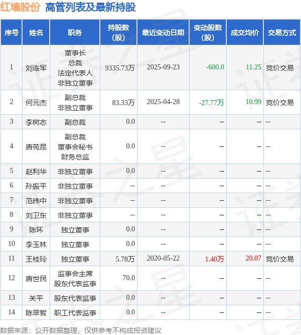 红墙股份的高管列表及最新持股情况如下: