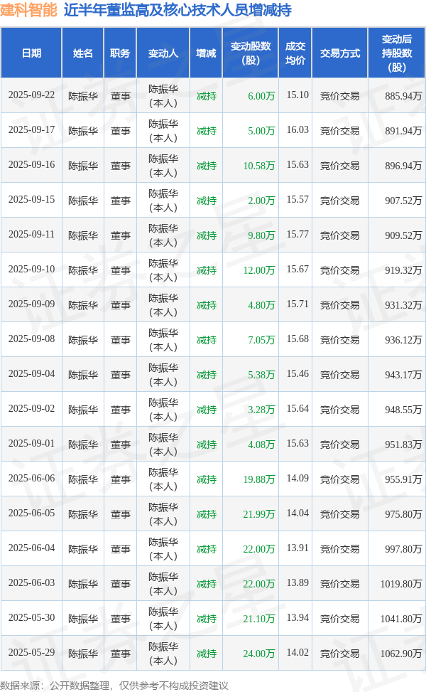 建科智能近半年内的董监高及核心技术人员增减持详情如下: