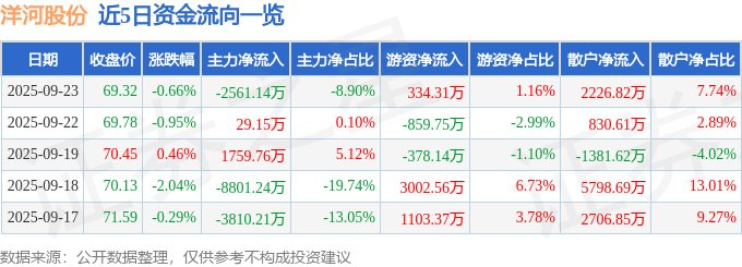 证券之星消息,截至2025年9月23日收盘,洋河股份(002304)报收于69.32元,下跌0.66%,换手率0.28%,成交量4.15万手,成交额2.88亿元。