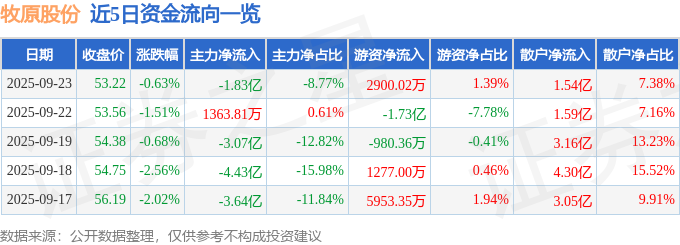 证券之星消息,截至2025年9月23日收盘,牧原股份(002714)报收于53.22元,下跌0.63%,换手率1.03%,成交量39.24万手,成交额20.91亿元。