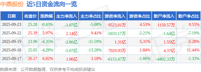 证券之星消息,截至2025年9月23日收盘,中鼎股份(000887)报收于25.28元,下跌0.43%,换手率6.34%,成交量83.3万手,成交额21.03亿元。
