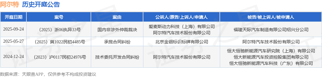 案号:(2025)浙06执异33号根据统计,近一年内以阿尔特汽车技术股份有限公司为当事人的历史开庭公告有3则,其中案由为“国内非涉外仲裁裁决”的公告以1则居首,其次为“承揽合同纠纷”有1则,“技术委托开发合同纠纷”有1则。历史开庭公告如下: