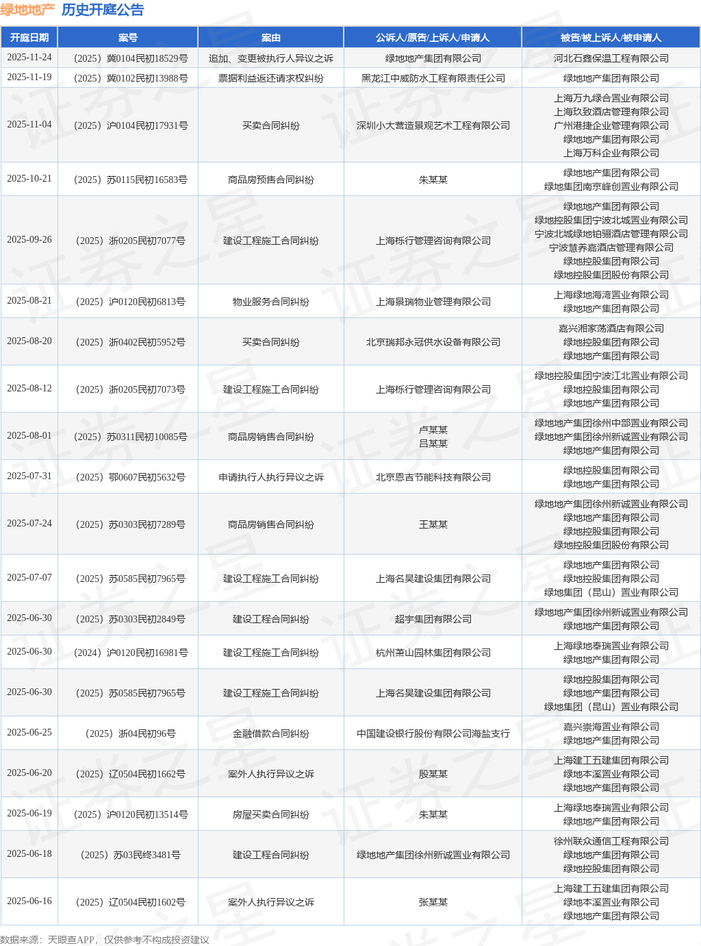 案号:(2025)浙0205民初7077号根据统计,近一年内以绿地地产集团有限公司为当事人的历史开庭公告有99则,其中案由为“建设工程施工合同纠纷”的公告以18则居首,其次为“金融借款合同纠纷”有16则,“建设工程合同纠纷”有16则。历史开庭公告(前20条)如下: