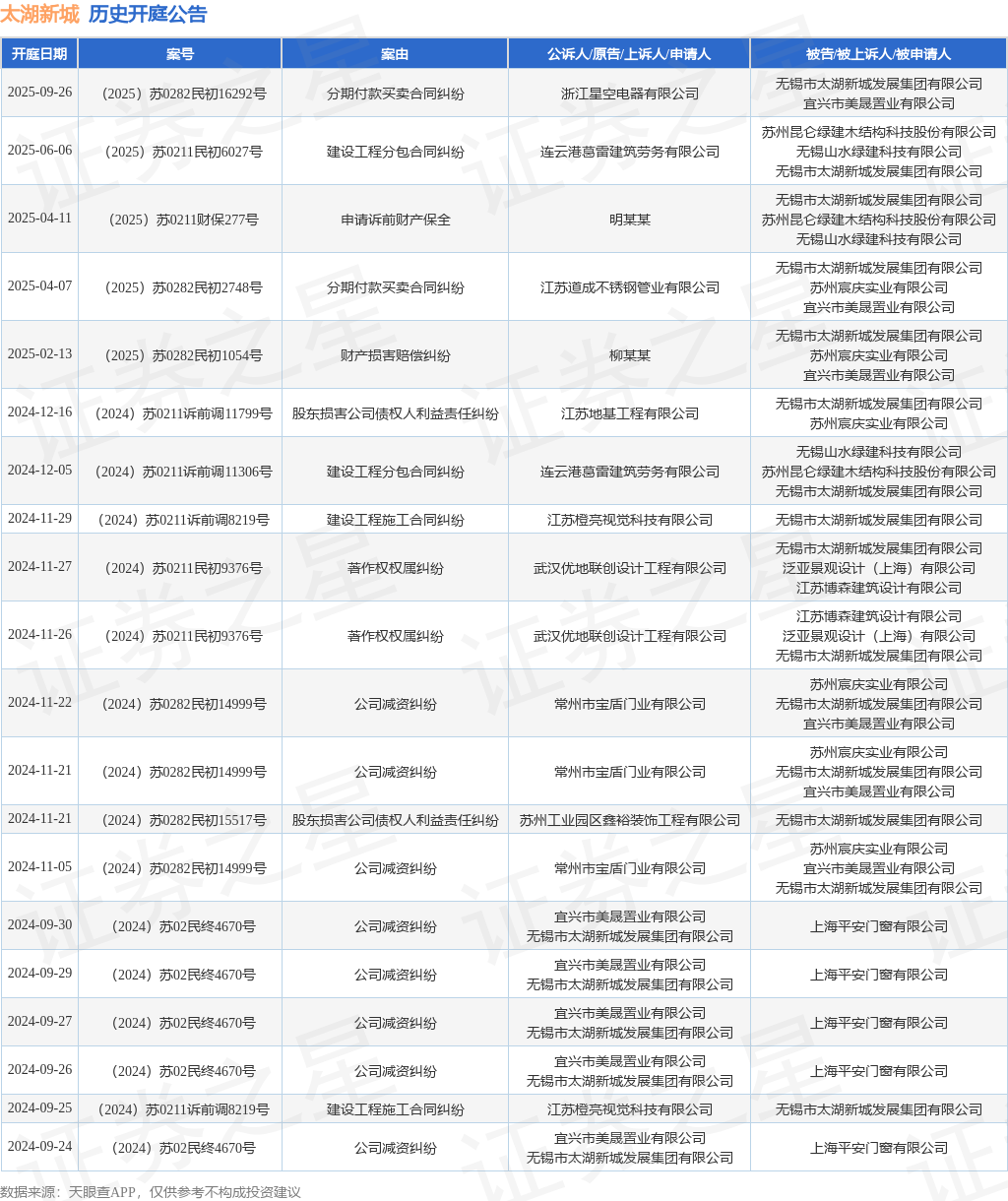 案号:(2025)苏0282民初16292号根据统计,近一年内以无锡市太湖新城发展集团有限公司为当事人的历史开庭公告有22则,其中案由为“公司减资纠纷”的公告以9则居首,其次为“著作权权属纠纷”有3则,“分期付款买卖合同纠纷”有2则。历史开庭公告(前20条)如下: