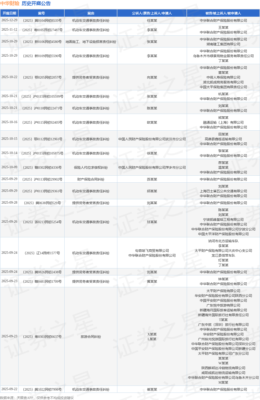 证券之星消息,根据天眼查APP显示,近日公布了一则中华联合财产保险股份有限公司作为被告/被上诉人的开庭公告,详细内容如下: