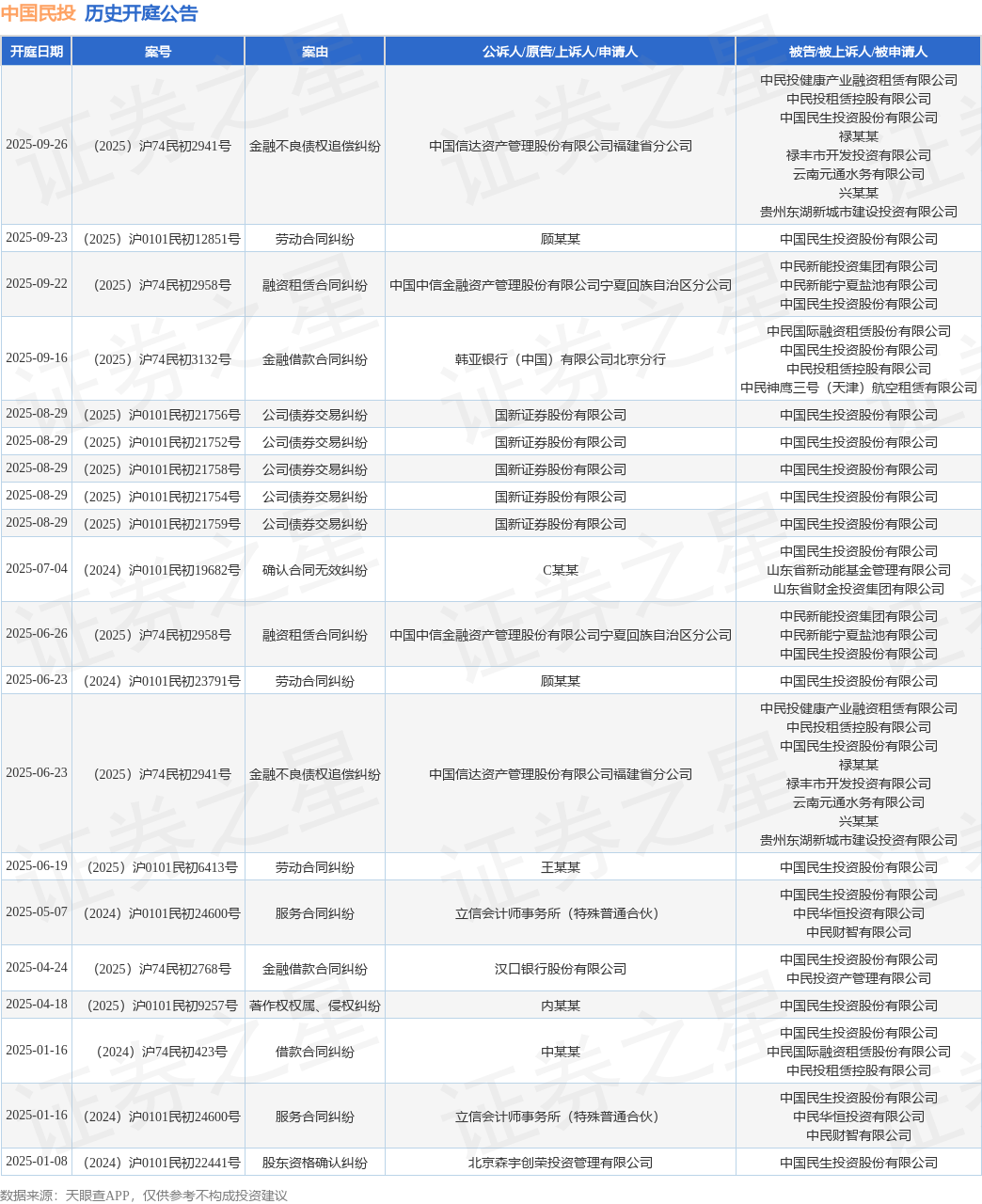 案号:(2025)沪74民初2941号根据统计,近一年内以中国民生投资股份有限公司为当事人的历史开庭公告有25则,其中案由为“公司债券交易纠纷”的公告以5则居首,其次为“劳动合同纠纷”有5则,“服务合同纠纷”有3则。历史开庭公告(前20条)如下: