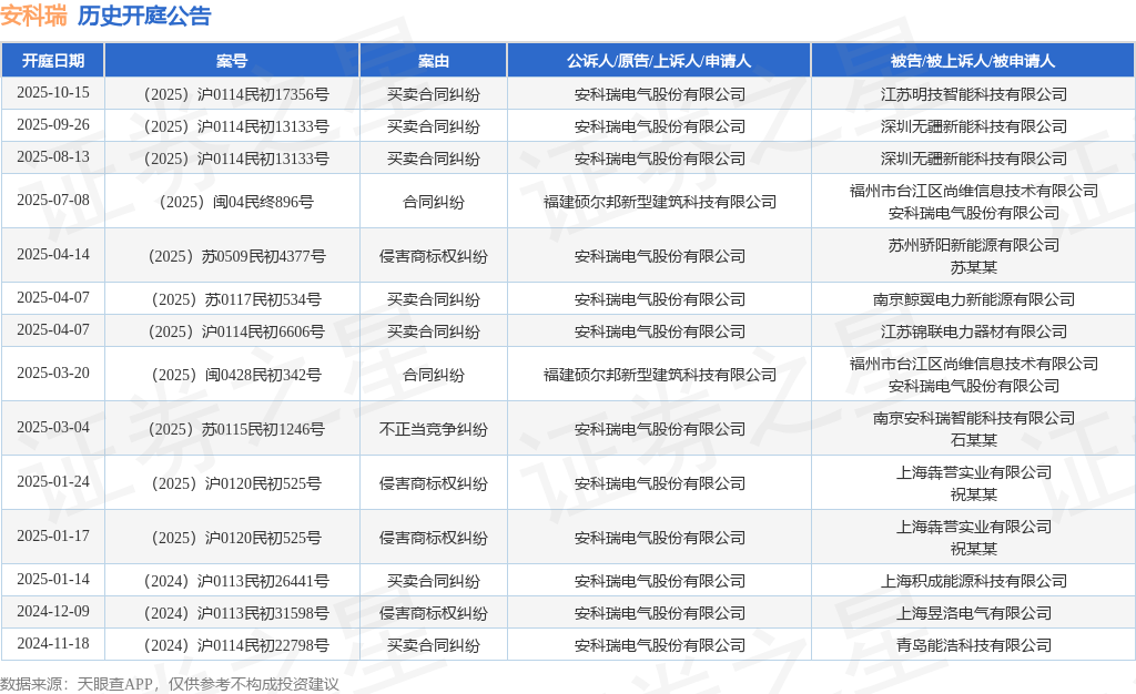 根据统计,近一年内以安科瑞电气股份有限公司为当事人的历史开庭公告有14则,其中案由为“买卖合同纠纷”的公告以7则居首,其次为“侵害商标权纠纷”有4则,“合同纠纷”有2则。历史开庭公告如下: