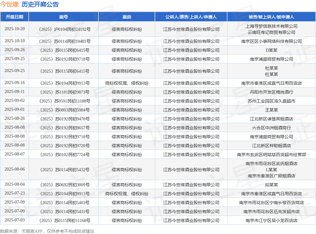 案号:(2025)苏0115民初6415号根据统计,近一年内以江苏今世缘酒业股份有限公司为当事人的历史开庭公告有83则,其中案由为“侵害商标权纠纷”的公告以70则居首,其次为“建设工程分包合同纠纷”有6则,“商标权权属、侵权纠纷”有3则。历史开庭公告(前20条)如下:
