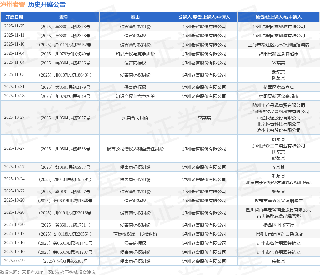 案号:(2025)浙1082民初6662号根据统计,近一年内以泸州老窖股份有限公司为当事人的历史开庭公告有377则,其中案由为“侵害商标权纠纷”的公告以280则居首,其次为“侵害商标权”有49则,“商标权权属、侵权纠纷”有12则。历史开庭公告(前20条)如下: