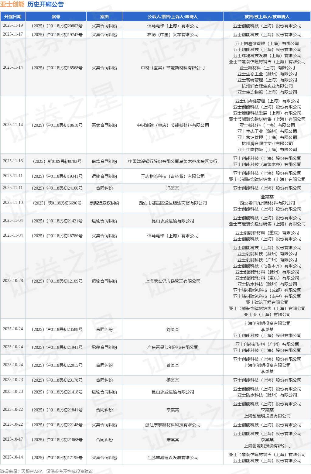 案号:(2025)沪0118民初20660号根据统计,近一年内以亚士创能科技(上海)股份有限公司为当事人的历史开庭公告有116则,其中案由为“买卖合同纠纷”的公告以35则居首,其次为“追偿权纠纷”有16则,“运输合同纠纷”有16则。历史开庭公告(前20条)如下: