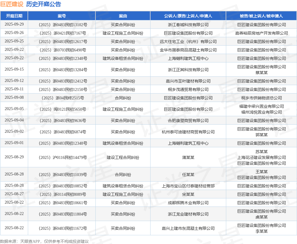 案号:(2025)浙0421民初7167号根据统计,近一年内以巨匠建设集团股份有限公司为当事人的历史开庭公告有250则,其中案由为“买卖合同纠纷”的公告以84则居首,其次为“合同纠纷”有39则,“建设工程施工合同纠纷”有38则。历史开庭公告(前20条)如下: