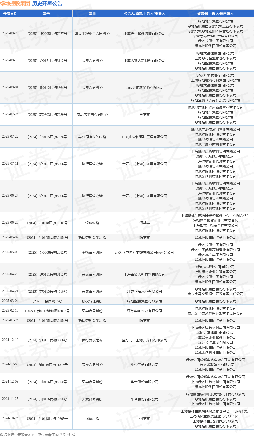 案号:(2025)浙0205民初7077号根据统计,近一年内以绿地控股集团股份有限公司为当事人的历史开庭公告有20则,其中案由为“买卖合同纠纷”的公告以8则居首,其次为“执行异议之诉”有3则,“确认劳动关系纠纷”有2则。历史开庭公告如下: