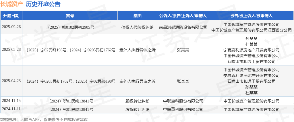 证券之星消息,根据天眼查APP显示,近日公布了一则中国长城资产管理股份有限公司作为被告/被上诉人的开庭公告,详细内容如下: