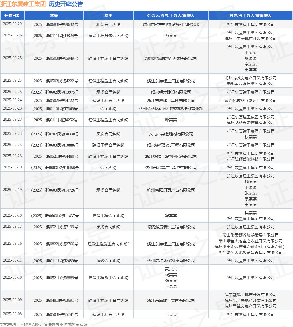 案号:(2025)浙0111民初9824号根据统计,近一年内以浙江东厦建工集团有限公司为当事人的历史开庭公告有119则,其中案由为“买卖合同纠纷”的公告以25则居首,其次为“建设工程施工合同纠纷”有20则,“合同纠纷”有15则。历史开庭公告(前20条)如下: