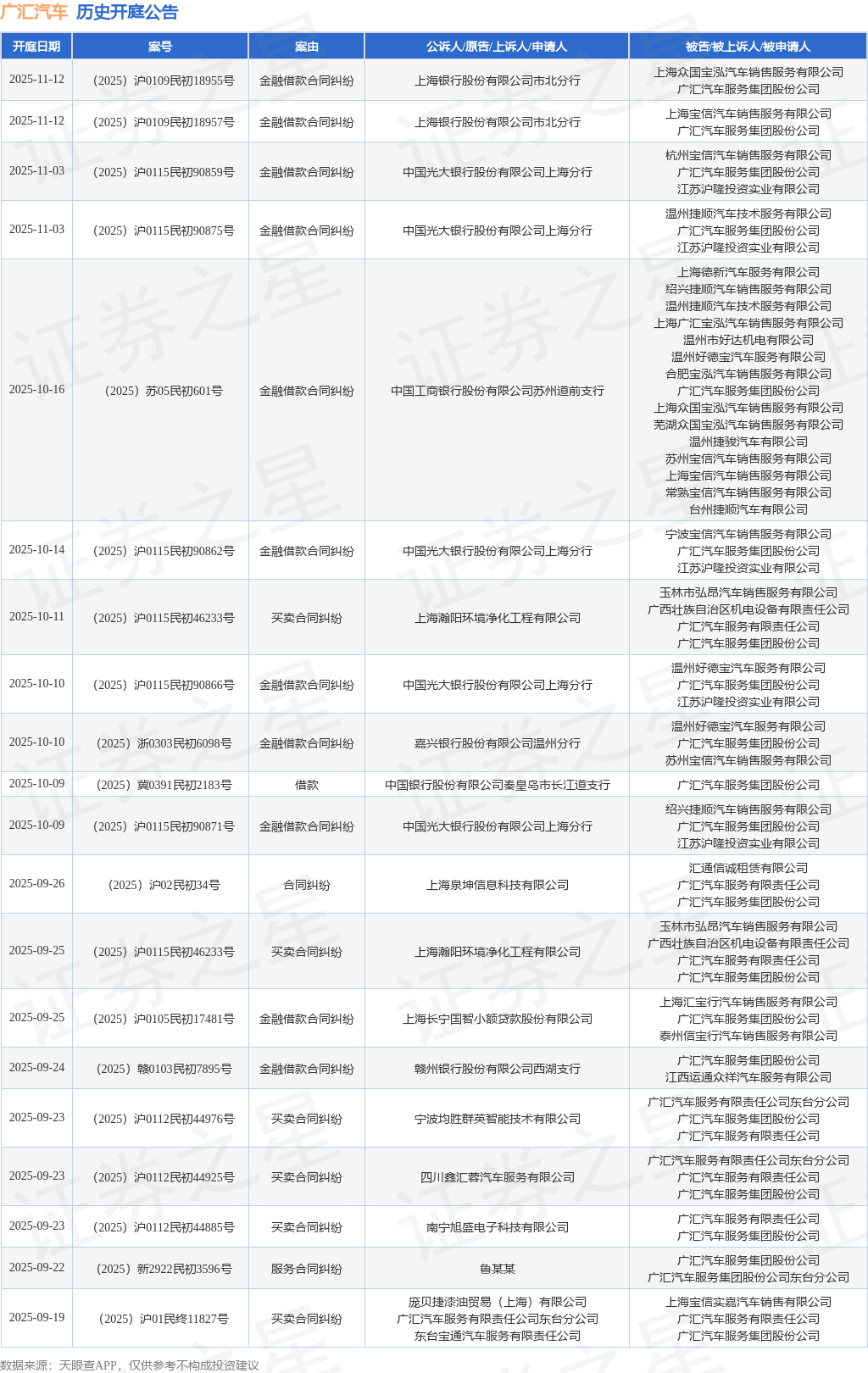案号:(2025)沪02民初34号根据统计,近一年内以广汇汽车服务集团股份公司为当事人的历史开庭公告有103则,其中案由为“买卖合同纠纷”的公告以36则居首,其次为“金融借款合同纠纷”有35则,“服务合同纠纷”有11则。历史开庭公告(前20条)如下: