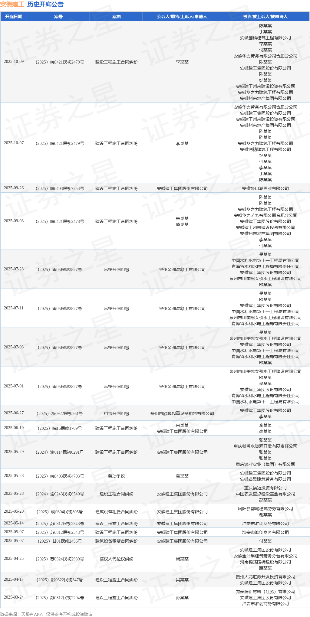 案号:(2025)皖0403民初7253号根据统计,近一年内以安徽建工集团股份有限公司为当事人的历史开庭公告有43则,其中案由为“建设工程施工合同纠纷”的公告以19则居首,其次为“建设工程合同纠纷”有7则,“承揽合同纠纷”有4则。历史开庭公告(前20条)如下:
