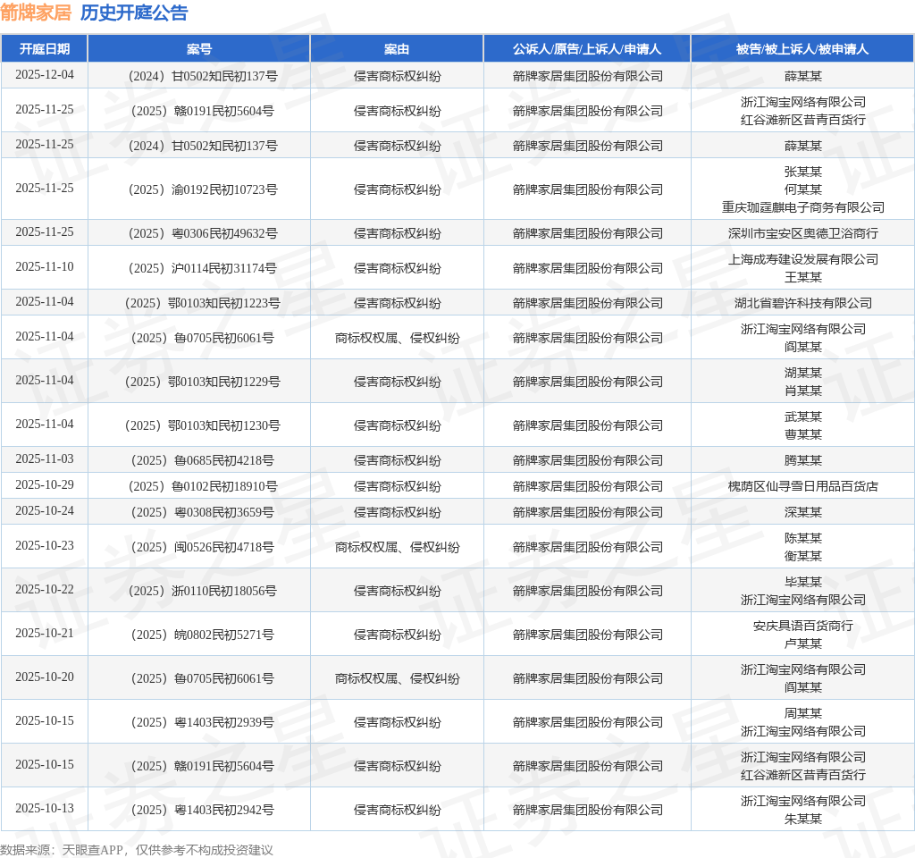案号:(2025)沪0110民初14069号根据统计,近一年内以箭牌家居集团股份有限公司为当事人的历史开庭公告有536则,其中案由为“侵害商标权纠纷”的公告以464则居首,其次为“商标权权属、侵权纠纷”有24则,“不正当竞争纠纷”有8则。历史开庭公告(前20条)如下: