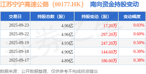 证券之星消息,9月23日南向资金增持17.2万股江苏宁沪高速公路(00177.HK)。近5个交易日中,获南向资金增持的有5天,累计净增持892.8万股。近20个交易日中,获南向资金增持的有16天,累计净增持2055.13万股。截至目前,南向资金持有江苏宁沪高速公路(00177.HK)4.96亿股,占公司已发行普通股的40.57%。