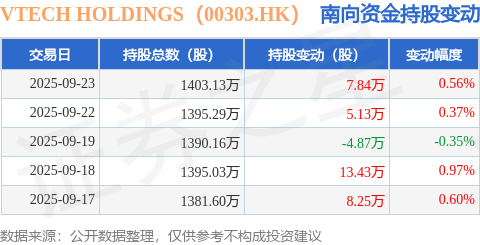 证券之星消息,9月23日南向资金增持7.84万股VTECH HOLDINGS(00303.HK)。近5个交易日中,获南向资金增持的有4天,累计净增持29.78万股。近20个交易日中,获南向资金减持的有11天,累计净减持33.86万股。截至目前,南向资金持有VTECH HOLDINGS(00303.HK)1403.13万股,占公司已发行普通股的5.53%。