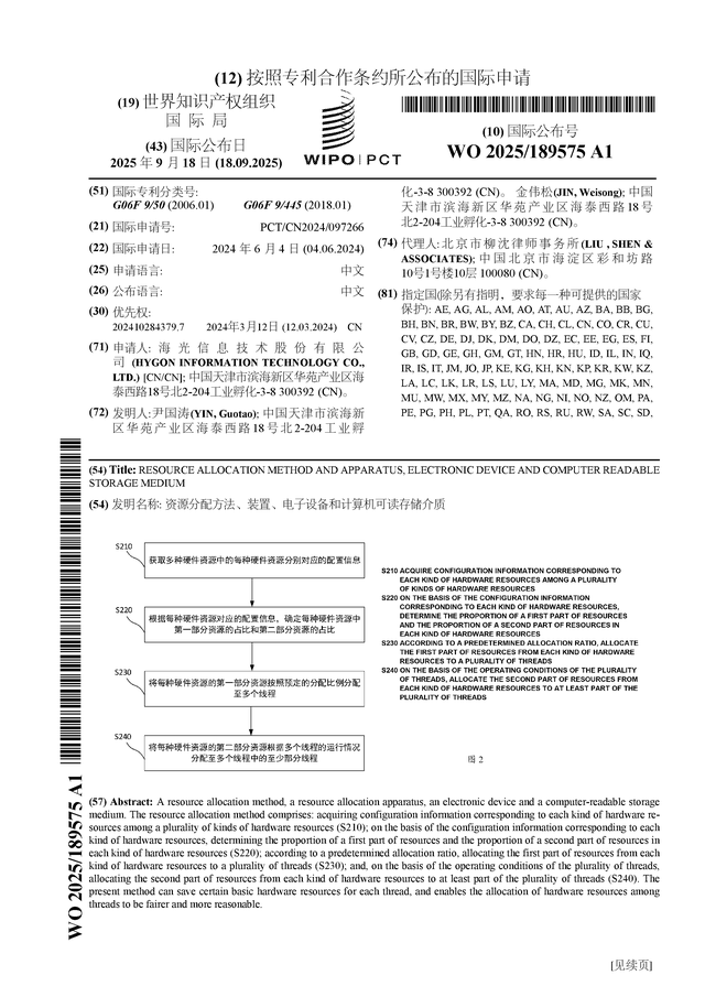 证券之星消息,根据企查查数据显示海光信息(688041)公布了一项国际专利申请,专利名为“资源分配方法、装置、电子设备和计算机可读存储介质”,专利申请号为PCT/CN2024/097266,国际公布日为2025年9月18日。