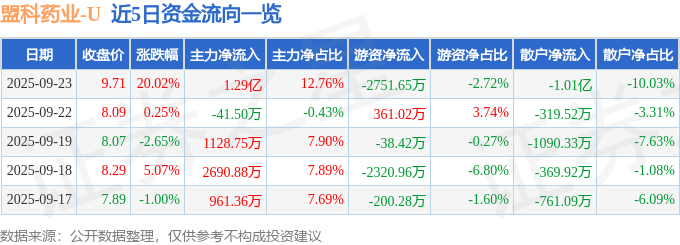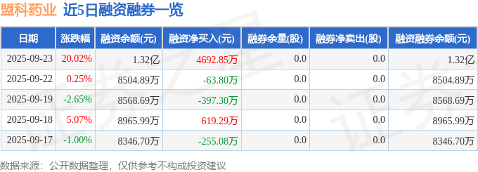 证券之星消息,截至2025年9月23日收盘,盟科药业(688373)报收于9.71元,上涨20.02%,涨停,换手率20.43%,成交量107.38万手,成交额10.1亿元。